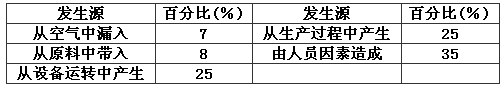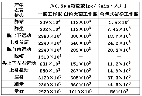 4.3.1、4.3.2 人員與物料進入潔凈室會把外部污染物帶入室內,特別是人員本身就是一個重要的污染源,不同衣著、不同動作時的人體產塵量見表5。從表5中數據可見,身著普通服裝的人走動時的產塵(大于或等于0.5μm)量可達近300×104pc/(min·人)。根據國外有關資料報道,潔凈室中的灰塵來源分析見表6,來源于人員因素的占35%。對潔凈室空氣抽樣分析也發現,主要的污染物有人的皮膚微屑、衣服織物的纖維與室外大氣中同樣性質的微粒。由此可見,要獲得生產環境所需要的空氣潔凈度,人員與物料的凈化是十分必要的。