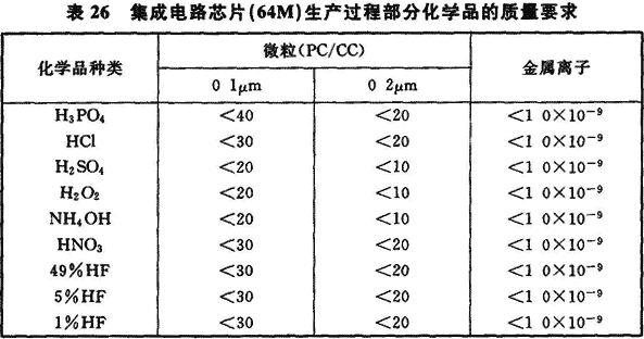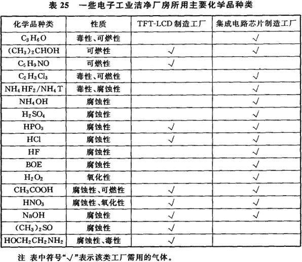 11.1.1 電子工業潔凈廠房常常需使用各種化學品,根據電子產品品種及其生產工藝的不同,各種電子產品生產所使用的化學品是不相同的,其中以集成電路芯片制造過程、TFT—LCD生產過程所需的化學品品種多,有的純度要求嚴格,表25是這兩種電子產品生產用潔凈廠房內所用的主要化學品種類。表26是有關資料提出的集成電路芯片64M生產過程部分化學品的質量要求。