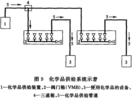11.3.3 對一些使用多種化學品的管道供應系統的國內電子工業潔凈廠房的調查和相關的技術資料介紹表明,為確?;瘜W品供應輸送系統的安全和有利于連接多臺生產設備共用一條管路系統,一般在液體化學品供應系統中設有化學品供應分配閥箱(Valve Manifold Box,簡稱VMB,如圖9所示)。故作本規定。