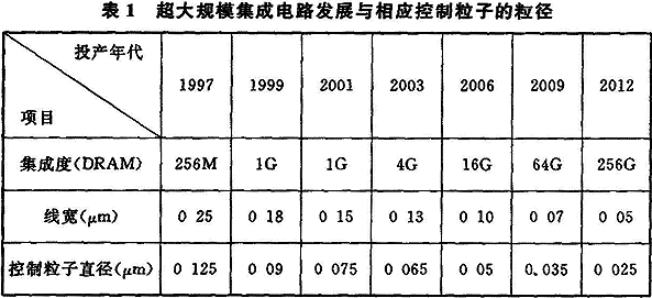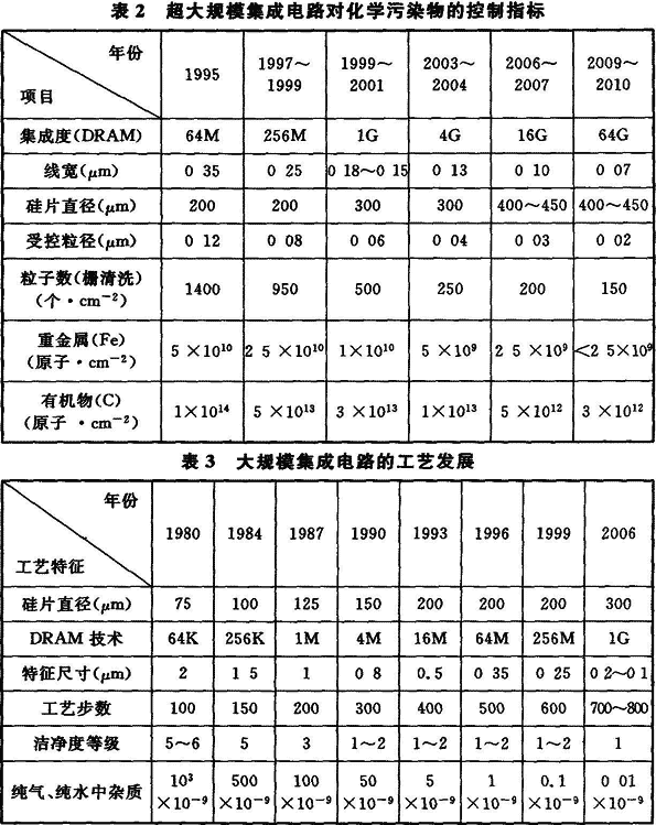 3.1.1~3.1.3 隨著科學技術的發展,電子產品生產日新月異,以微電子產品為代表的各種電子產品生產技術發展迅速?,F代電子產品要求微型化、精密化、高純度、高質量和高可靠性,以人們熟悉的手機、筆記本電腦為例,它所使用的集成電路、電子元器件以及其組裝的生產過程都要求在受控環境條件下進行操作,其中以集成電路生產過程對受控環境的要求尤為嚴格,當今線寬為45nm的超大規模集成電路產品已投入生產,其受控生產環境——潔凈室(區)的受控粒子尺寸要求小于0.02μm甚至更小。表1是超大規模集成電路的發展及相應控制粒子的粒徑。集成電路產品的生產和研究表明,超大規模集成電路生產所需受控環境不僅嚴格控制微粒,而且還需嚴格控制生產環境的化學污染物和直接與產品生產過程接觸的各種介質——高純水、高純氣體、化學品的純度和雜質含量,表2是超大規模集成電路對化學污染物的控制指標。表3是大規模集成電路的工藝發展。