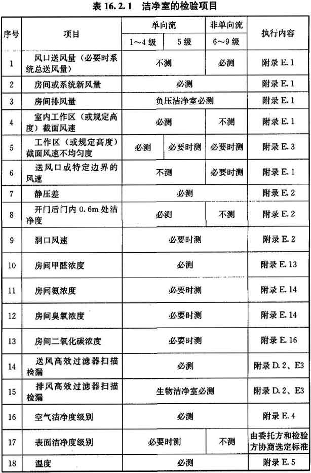 16.2.1 潔凈室在高效過濾器現場檢漏后的必測項目,應符合表16.2.1的要求,也可由該表選擇選測項目。