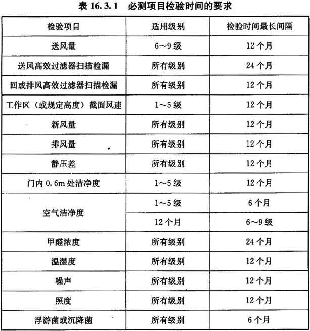 16.3.1 在工程驗收后為確認潔凈室的必測項日符合要求的日常檢驗周期,可按表16.3.1確定。