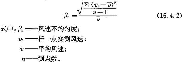 16.4.2 當需對室內單向流品質作細致確認時,可測工作區(或規定高度)截面風速不均勻度。風速不均勻度應按附錄E檢驗,并按下式計算,結果不應大于0.25。