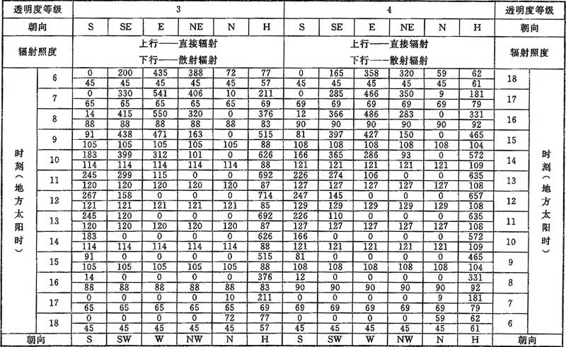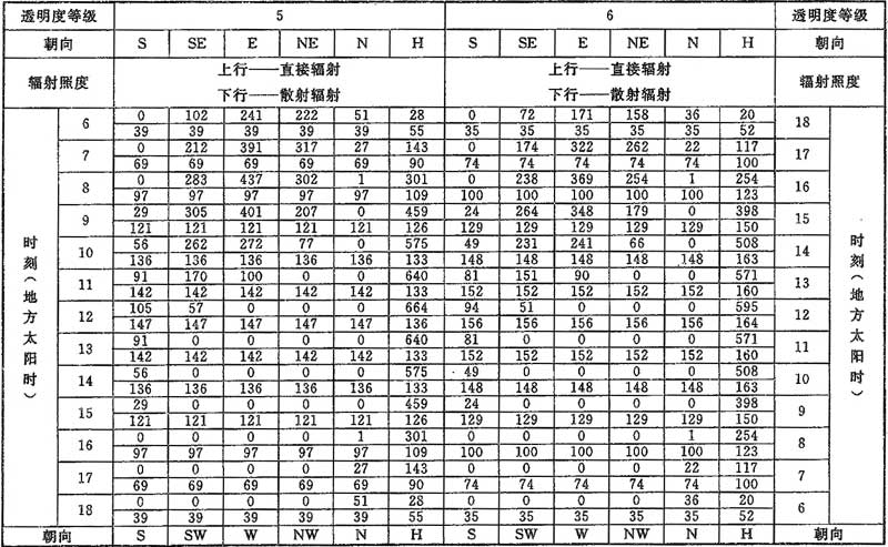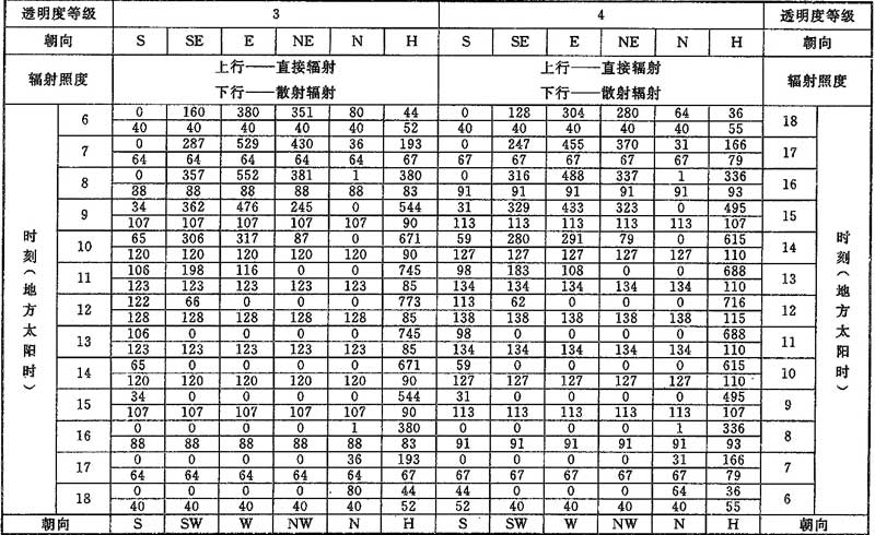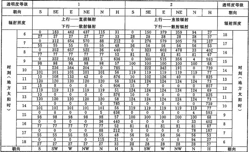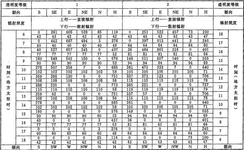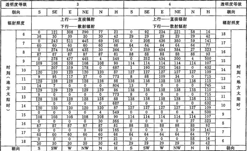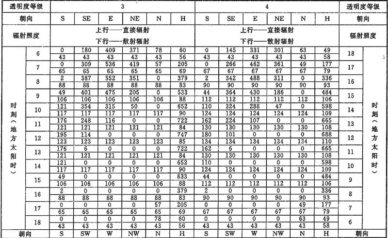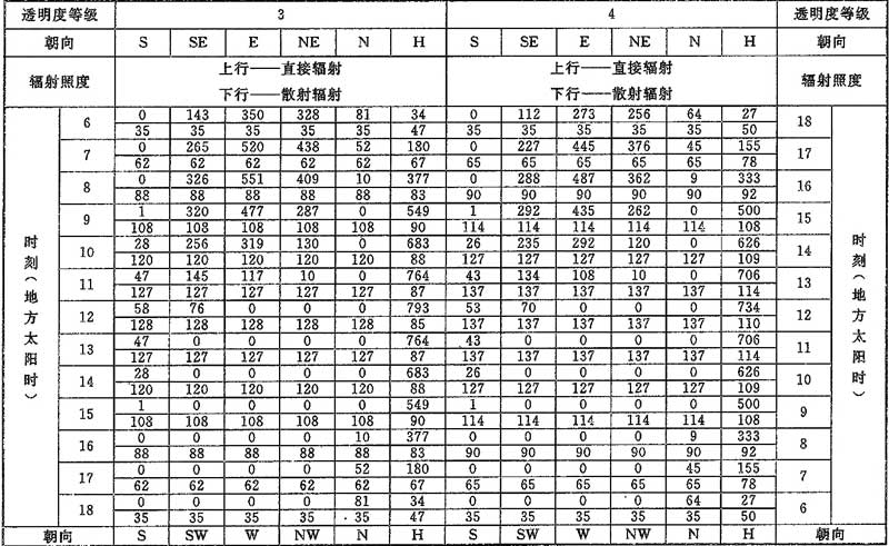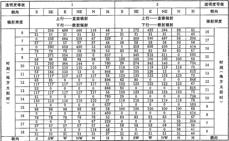 表D.0.1-6 北緯45°透過標準窗玻璃的太陽輻射照度(W/m2)