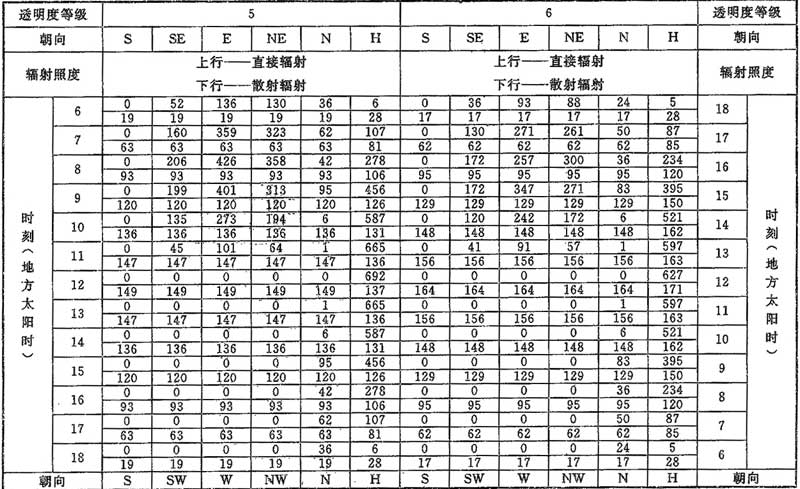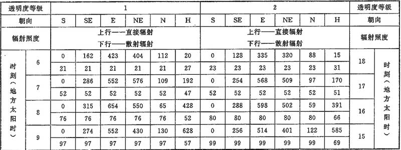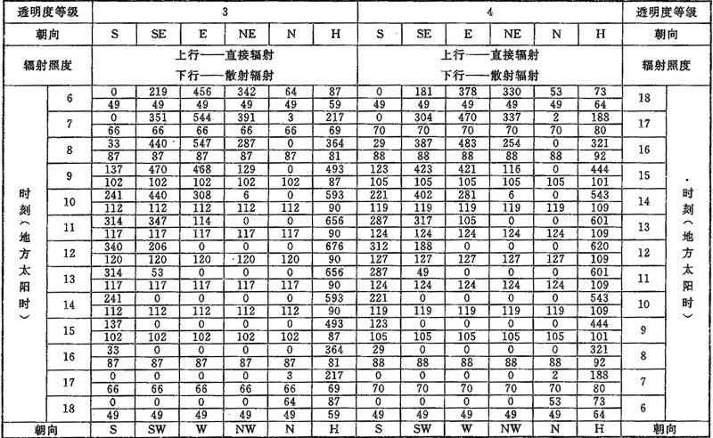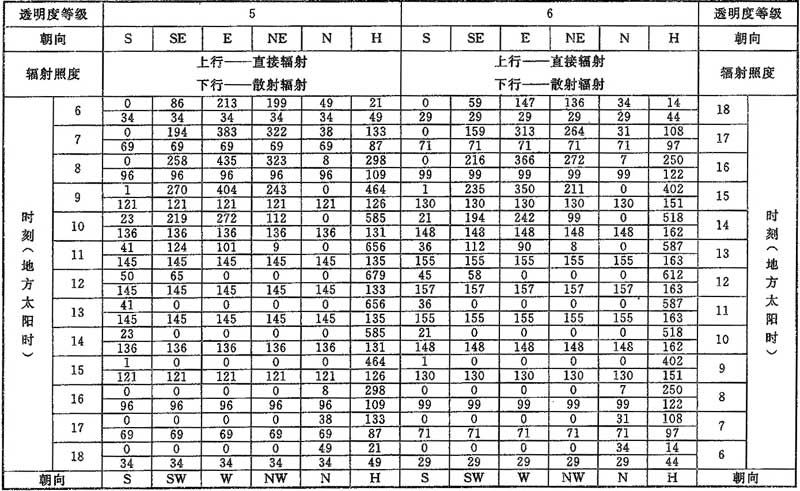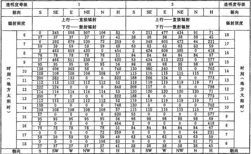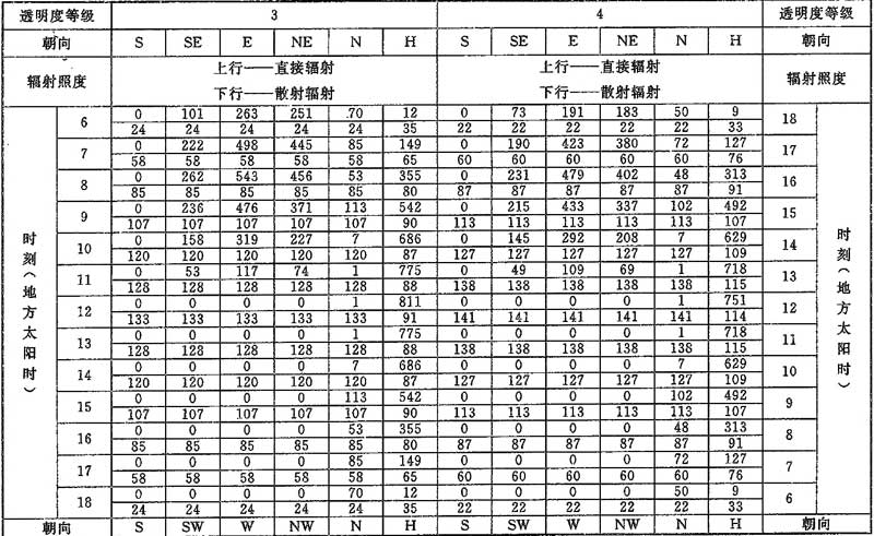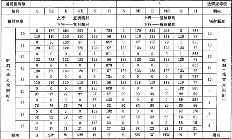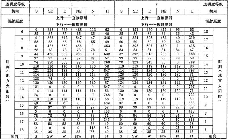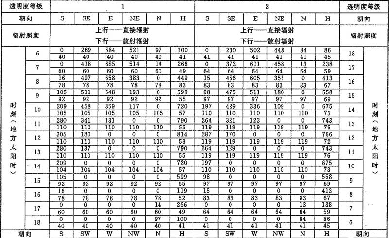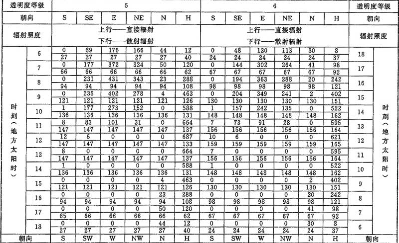 表D.0.1-6 北緯45°透過標準窗玻璃的太陽輻射照度(W/m2)