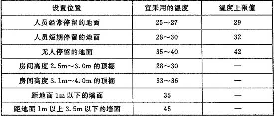 5.7.2 低溫加熱電纜輻射供暖宜采用地板式,低溫電熱膜輻射供暖宜采用頂棚式。輻射體表面平均溫度應符合本規(guī)范第5.4.1條的相關規(guī)定。