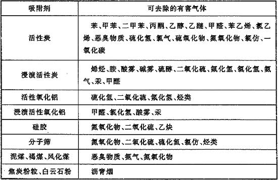 常用的吸附劑有活性炭、硅膠、活性氧化鋁或分子篩等。活性炭是應用較廣泛的一種吸附劑,特別是經浸漬處理后,應用更加廣泛。硅膠等吸附劑稱為親水性吸附劑,用于吸附水蒸氣和氣體干燥。各種吸附劑可去除的有害氣體見表6。