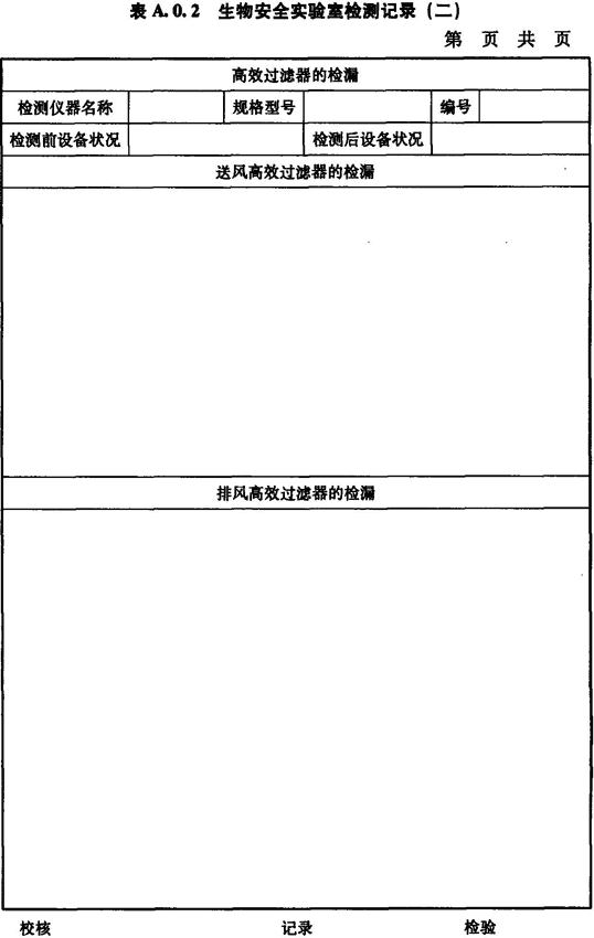 A.0.2 生物安全實驗室送風、排風高效過濾器檢漏情況應按表A.0.2進行記錄。