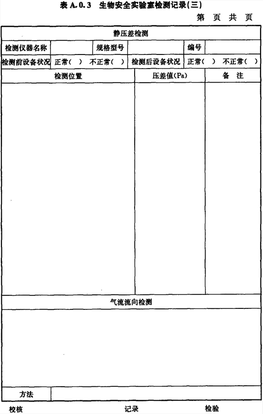 A.0.3 生物安全實驗室房間靜壓差和氣流流向的檢測應按表A.0.3進行記錄。