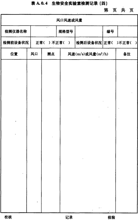 A.0.4 生物安全實驗室風口風速或風量的檢測應按表A.0.4進行記錄。