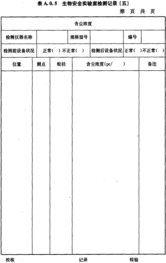 A.0.5.生物安全實驗室房間含塵濃度的檢測應按表A.0.5進行記錄。