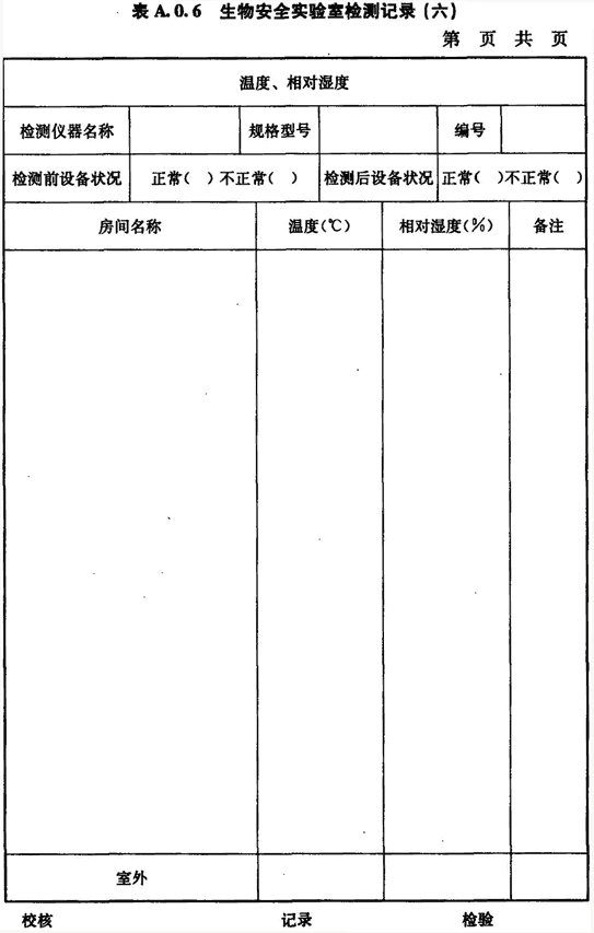 A.0.6 生物安全實驗室房間溫度、相對濕度的檢測應按表A.0.6進行記錄。