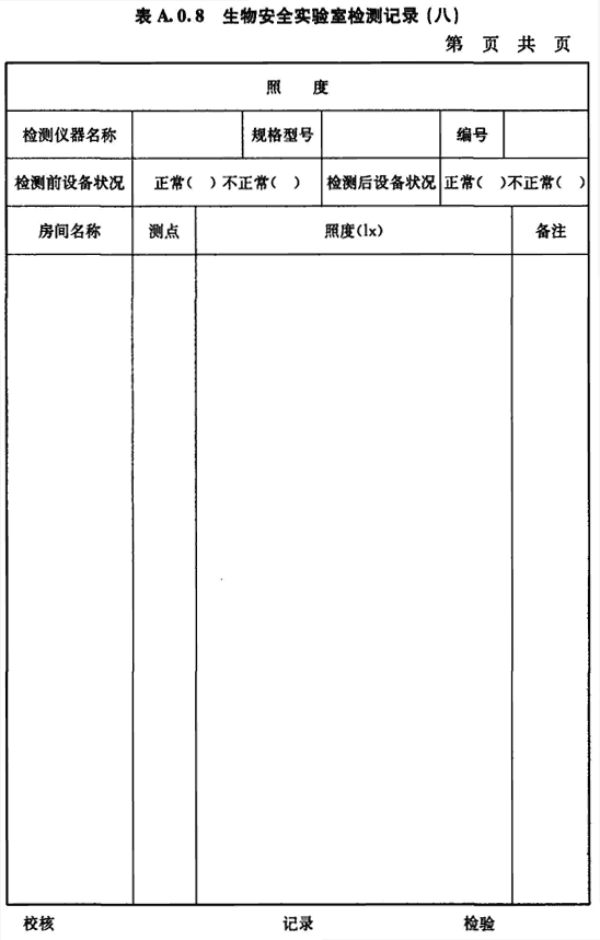 A.0.8 生物安全實驗室房間照度的檢測應按表A.0.8進行記錄。