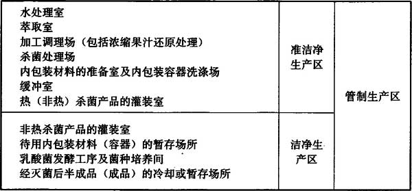 在《食品企業通用衛生規范》GB 14881-94中提出“要合理布局,劃分生產區和生活區”,在《熟肉制品企業生產衛生規范》GB 19303-2003中提出“生產作業區與生活區分開設置”。但是目前國內許多外資項目提倡采用聯合廠房,即在一個單體內包括了許多功能區,而國內投資項目通常喜歡將各個功能拆分為不同的單體建筑。為了避免對生活區、輔助區等名詞理解不一,又由于本規范重點在潔凈用房,所以不提生產、生活分區問題,而從生產區設置開始提出要求。對于現代食品工廠來說,“為了便于對不同生產區域進行設計和衛生管理,通常將食品工廠按車間(區域)的空氣潔凈度不同劃分為非食品處理區、一般生產區、準潔凈生產區和潔凈生產區”,見表1~表3。