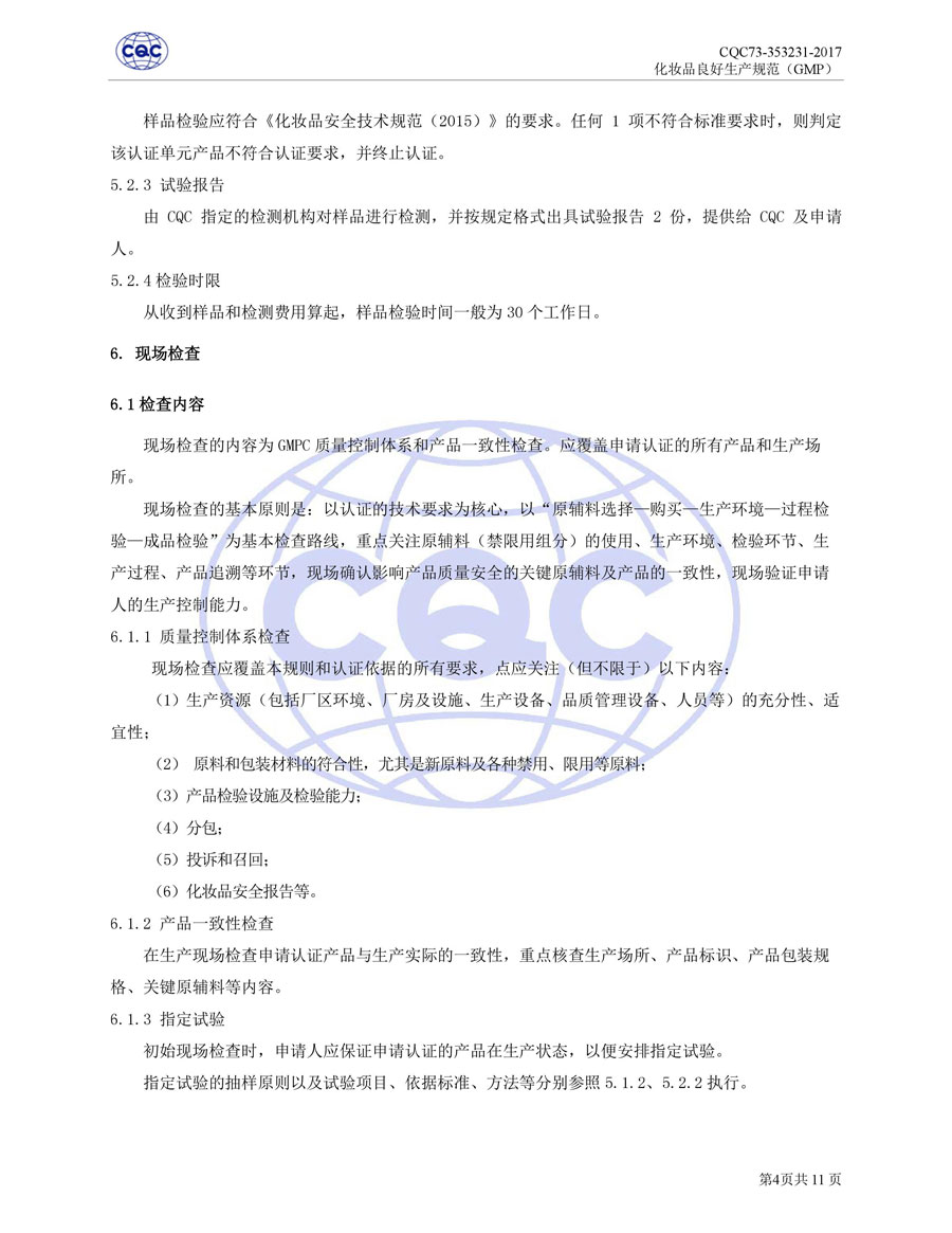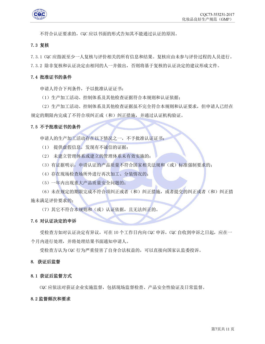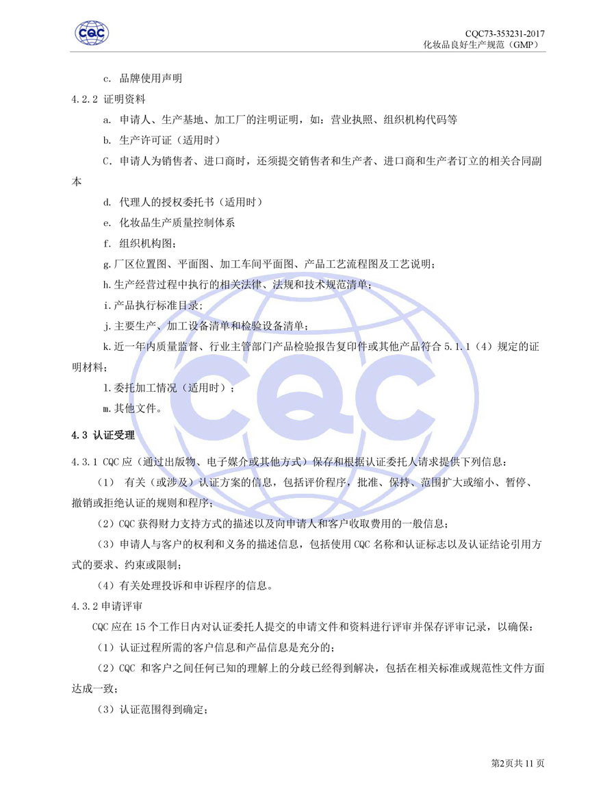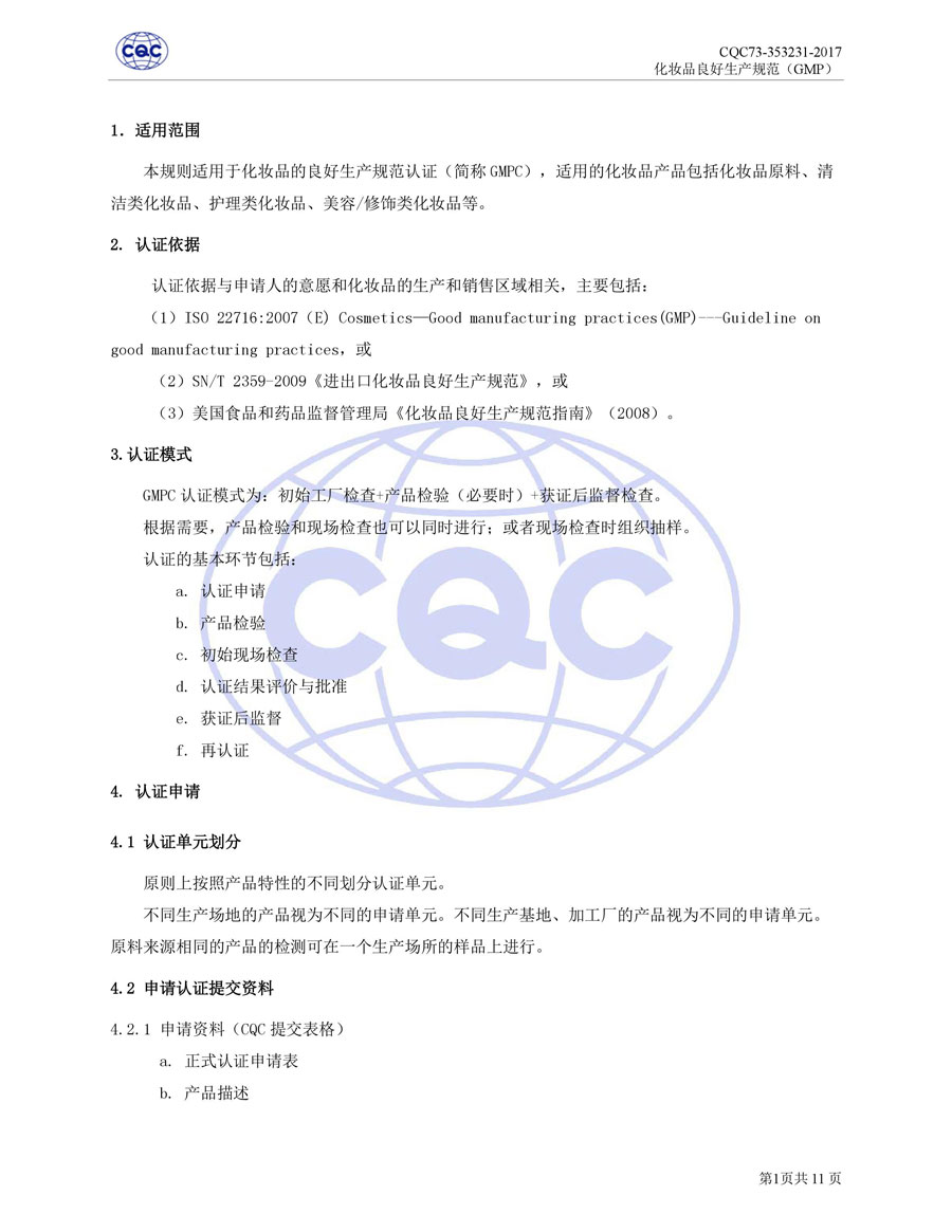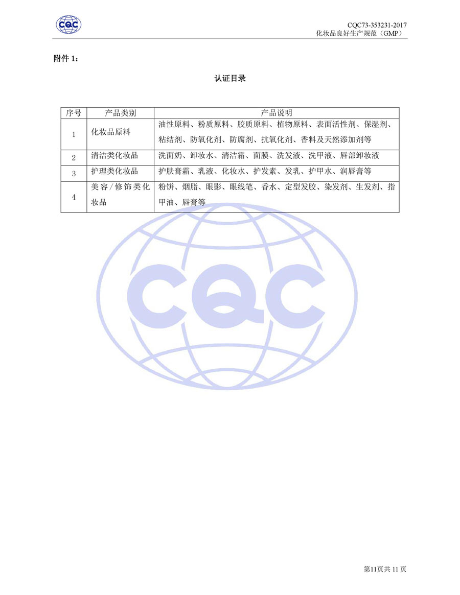 認證依據為美國農業部《Cosmetic Good Manufacturing Practice Guideline》, European Federation for Cosmetic Ingredients (EFfIC)-GMP for cosmetic ingredient,ISO 22716-2007《化妝品良好生產規范》、CQC73-353231-2016《化妝品認證實施規則》及適用的法律法規等。