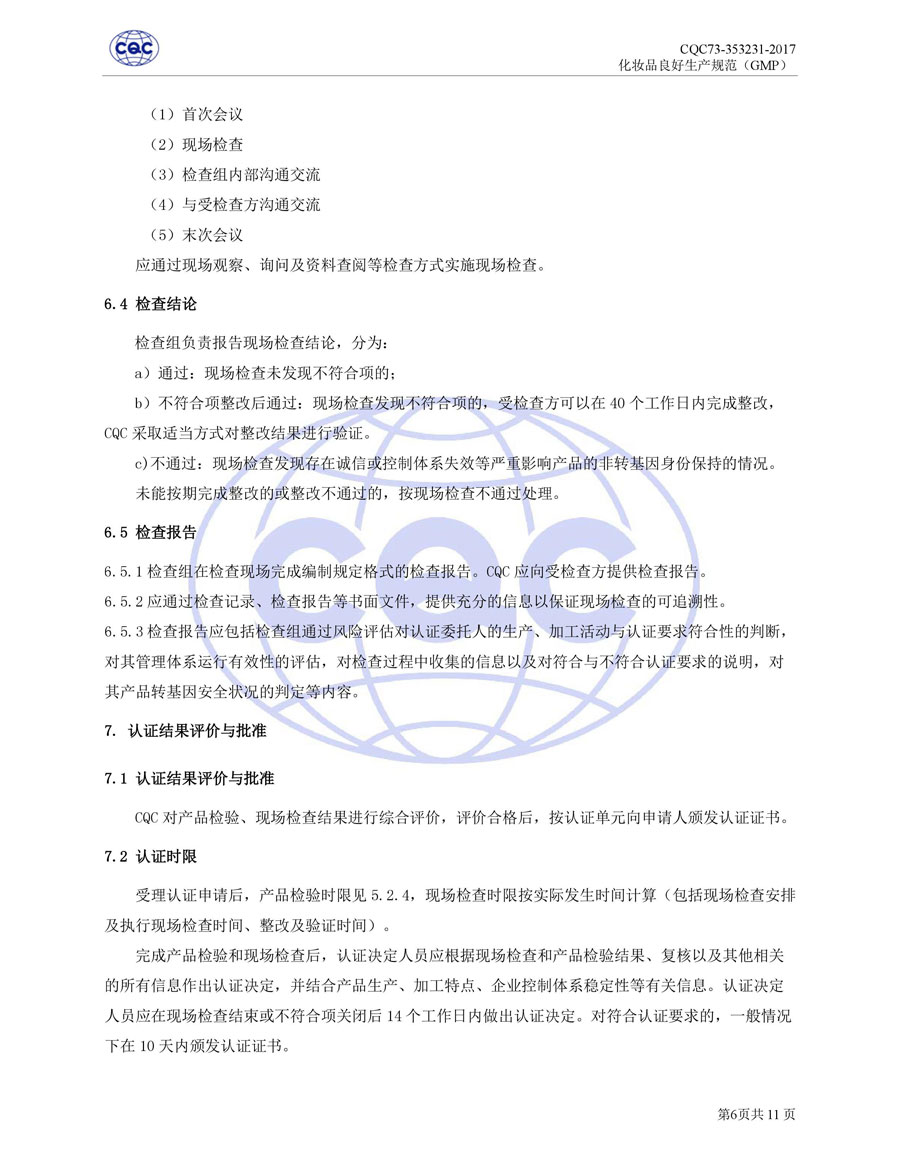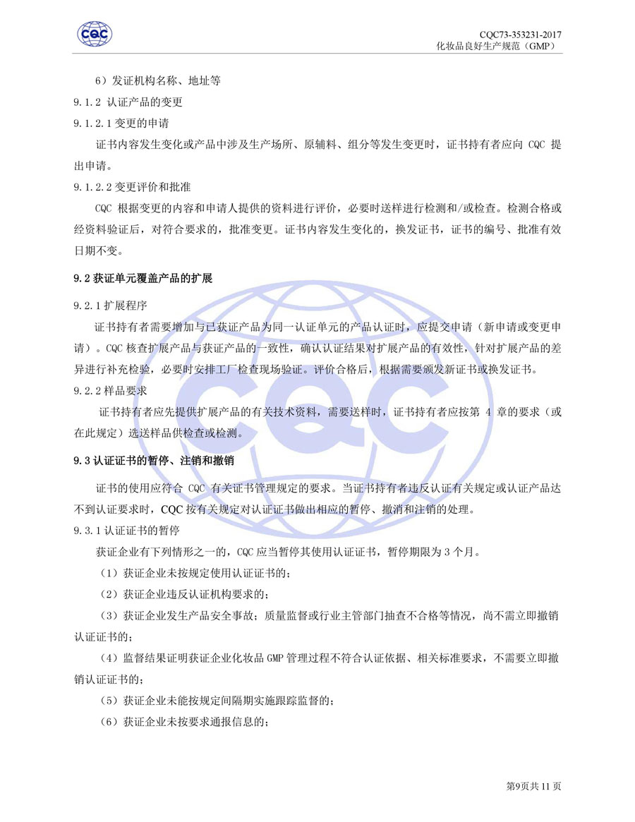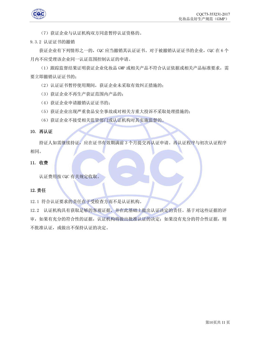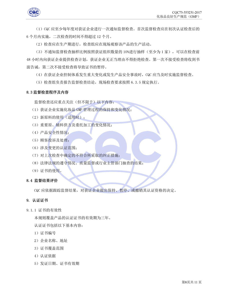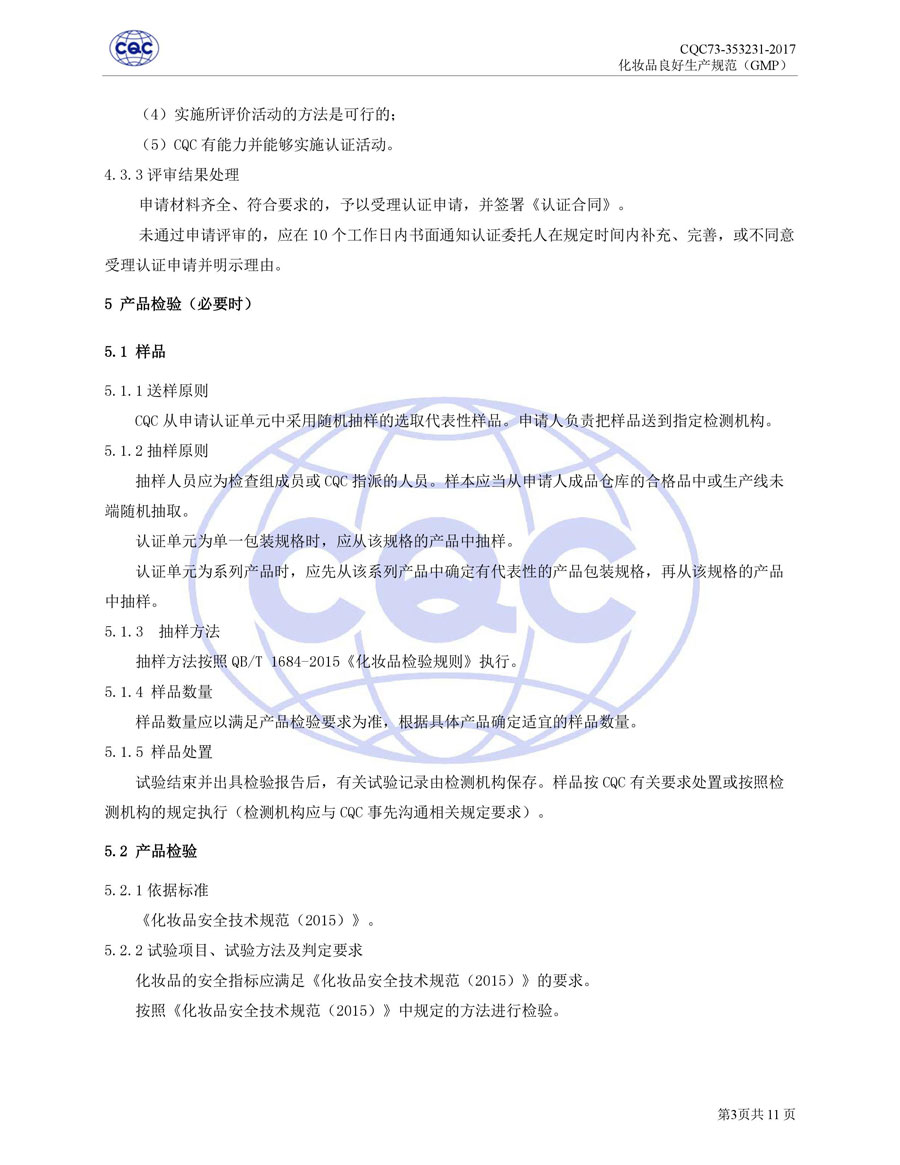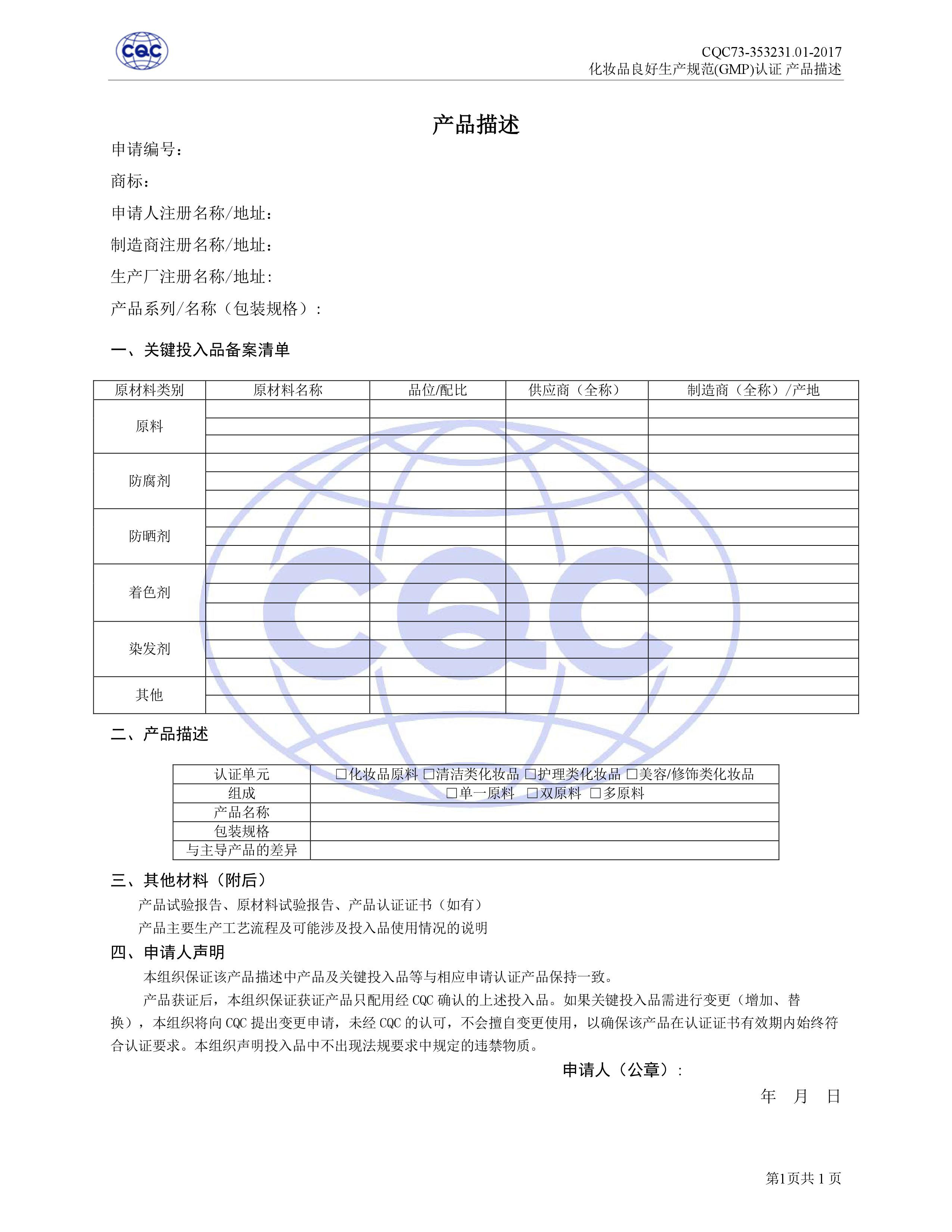 認證依據為美國農業部《Cosmetic Good Manufacturing Practice Guideline》, European Federation for Cosmetic Ingredients (EFfIC)-GMP for cosmetic ingredient,ISO 22716-2007《化妝品良好生產規范》、CQC73-353231-2016《化妝品認證實施規則》及適用的法律法規等。